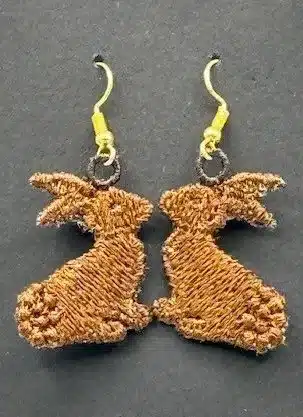 Beautiful, embroidered free standing lace Chocolate Bunnny Embroidered Earrings, created with thousands of stitches. These earrings are very lightweight. The size of the earrings are 1.2″ L X 1″ W. We manufacture these earrings at our facility in the USA.
