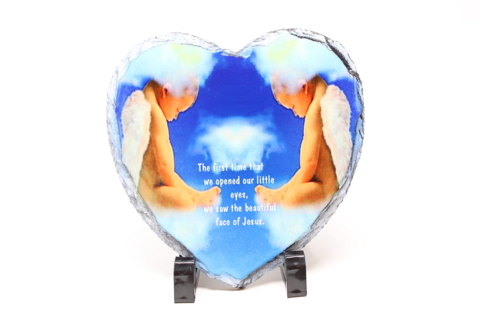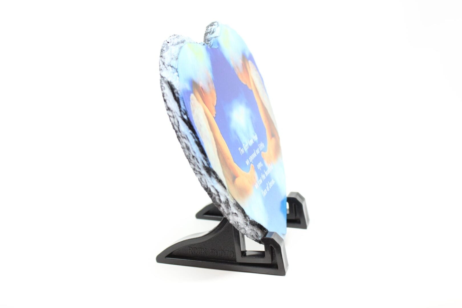 Our heart photo rock slate is a 1/4″ thick, with a white coating that is ready for your favorite photo. Made of actual stone with chipped edges. Each piece is handcrafted and chiseled with imperfect edges to make each slate unique.  Edges and back are dark charcoal grey. The Stone comes with two black plastic stands to display on any desk or mantle.  Memorialize a loved one or use your favorite inspirational quote.  Please be aware that these are natural stone and slight imperfections in the surface may occur.